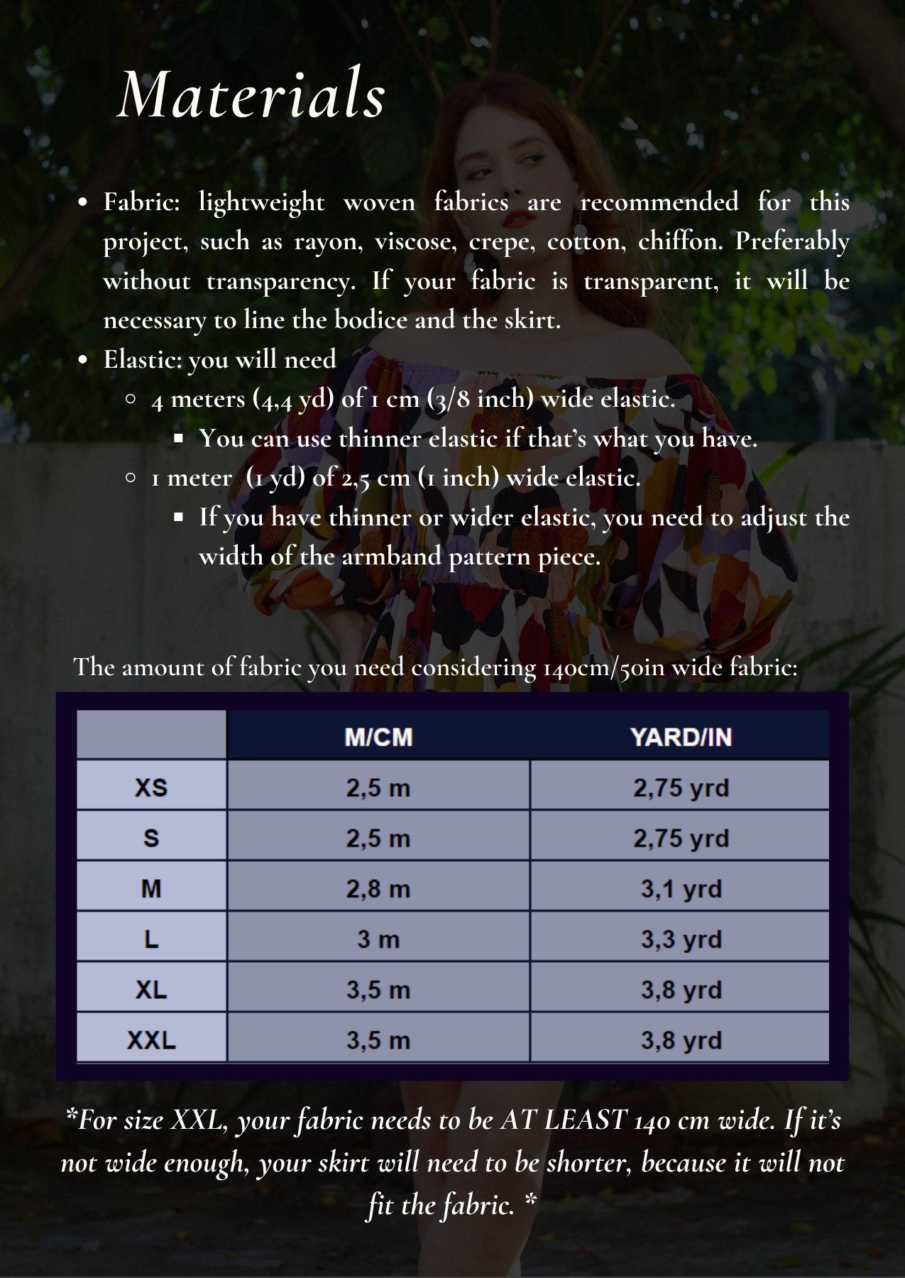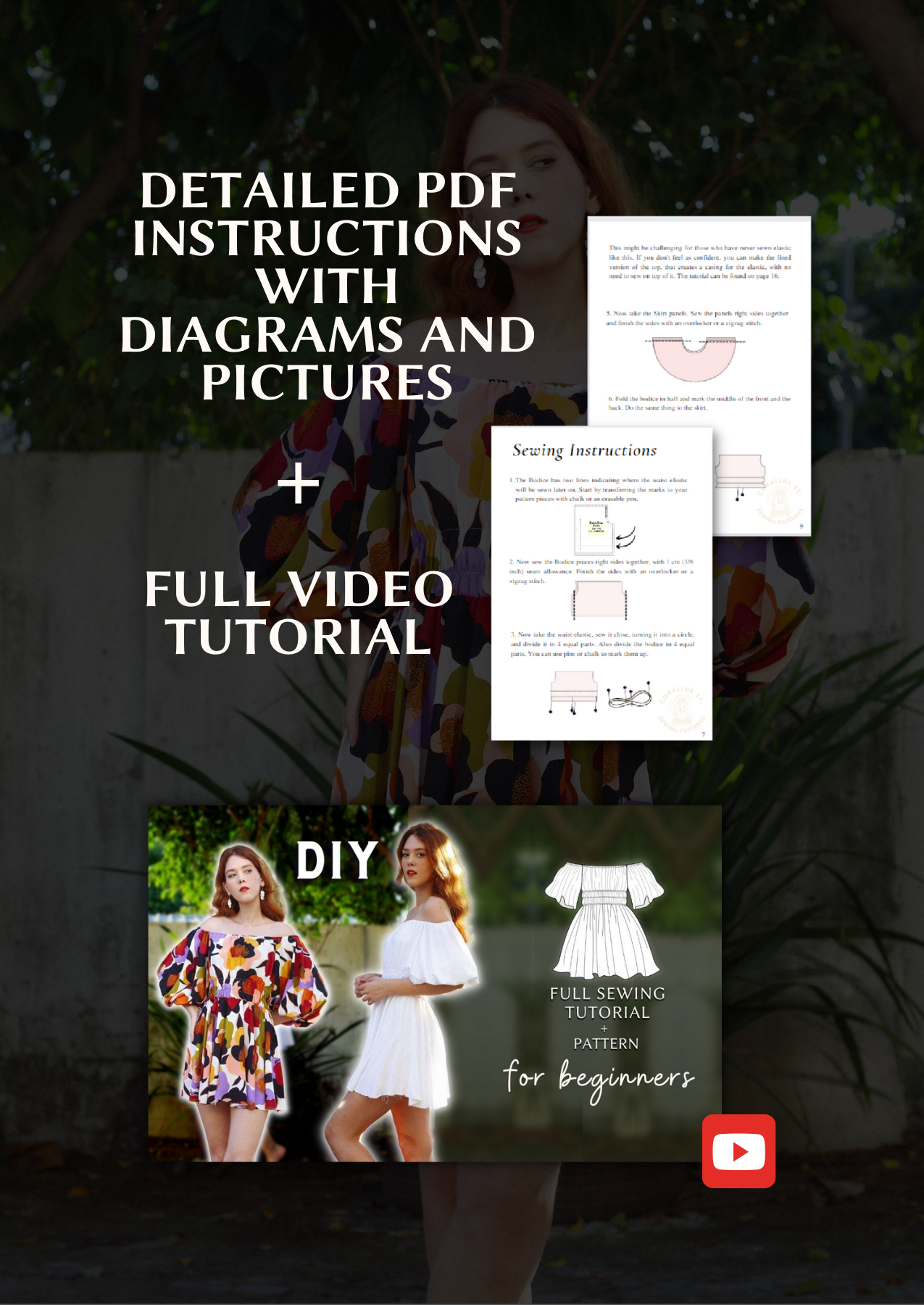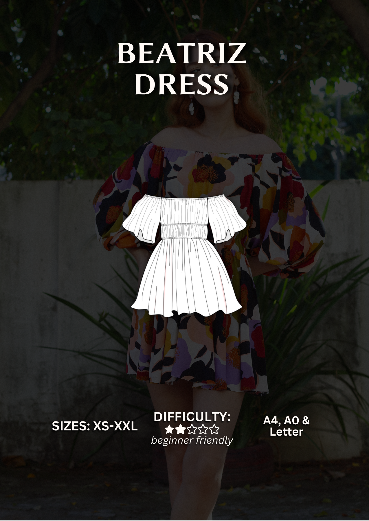 The Beatriz Dress is a girly and romantic off the shoulders dress, with puff sleeves that look like petals, and a flowy, gathered full circle skirt. Is perfect for beginner sewists, since doesn't require any advanced abilities, and can be finished quite fast, in around 3 hours. It's perfect for dancing, twirling around and having your best time.